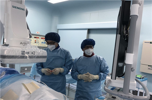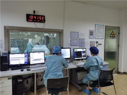 门诊楼介入手术室,曾和松教授、邱旭光副主任医师、陶敏老师正在为冠心病患者行冠脉介入手术