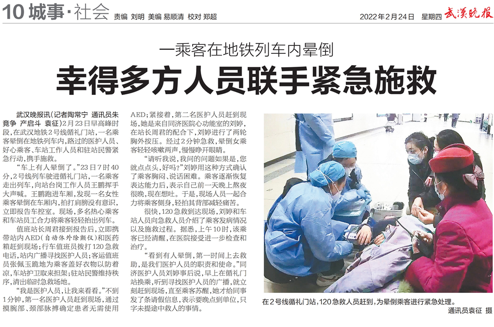 武汉晚报:一乘客在地铁列车内晕倒 幸得多方人员联手紧急施救