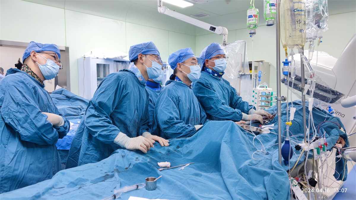 4月16日,在同济医院中法新城院区心血管内科导管室内,同济医院心血管内科主任曾和松教授、心内科主任医师周强、副主任医师崔广林,在超声科、麻醉科、血管外科等兄弟科室的共同协助下,成功完成了一站式经导管介入主动脉瓣置换术联合冠脉支架植入术,为一名62岁的男性一次性微创解决了“心门”与“血管”两大问题。目前患者已顺利康复出院,为治疗效果点了大大的“赞”!