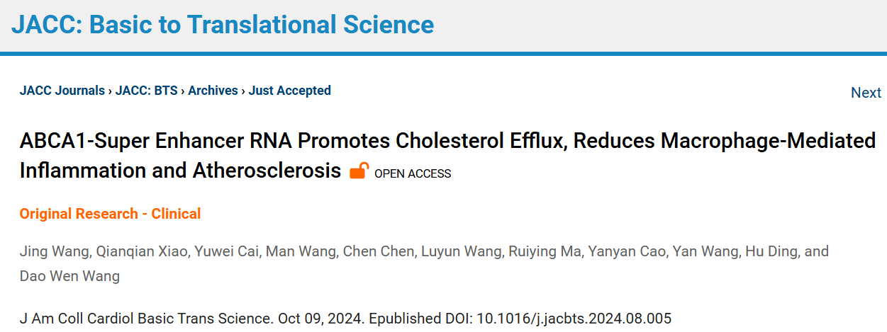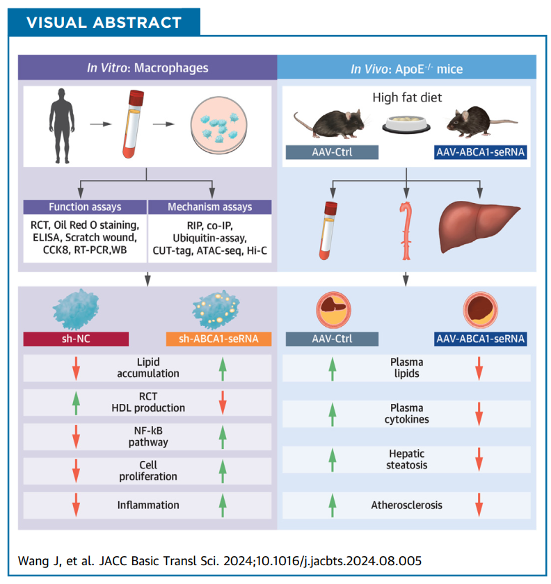 动脉粥样硬化是心脑血管疾病的主要原因,胆固醇是血管动脉粥样斑块的主要成分,目前虽然有降胆固醇药物能显著减轻冠心病等动脉粥样硬化性心血管病发病风险,但心血管病残余风险仍然存在。团队通过系统筛选并验证,超级增强子来源RNA ABCA1-seRNA在胆固醇稳态中的调控作用,发现其抗炎和抗动脉粥样硬化的表观调控新机制。