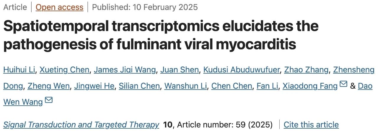 近日,华中科技大学同济医院心内科汪道文教授团队联合华大生命科学研究院方晓东研究员团队,利用华大时空组学技术和单核RNA测序技术解析暴发性心肌炎的发病机制,并揭示了静脉注射免疫球蛋白疗法在暴发性心肌炎治疗中的免疫调节和治疗潜力,最新研究成果发表于国际权威期刊《信号转导与靶向治疗》。