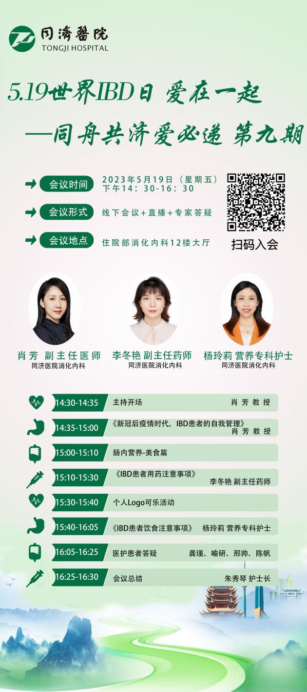 炎症性肠病(IBD)是一种病因未明的非特异性慢性肠道炎症性疾病,,主要包括溃疡性结肠炎和克罗恩病,预计到2025年,中国IBD患者总数将达到150万。 每年5月19日是世界炎症性肠病日,2023年5月19日,为提高炎症性肠病患者对疾病的正确认知和自我管理能力,以增强规范治疗的依从性,改善生活质量,同济医院消化内科主办了第九期“爱在一起——同舟共济 爱必递”患教活动。