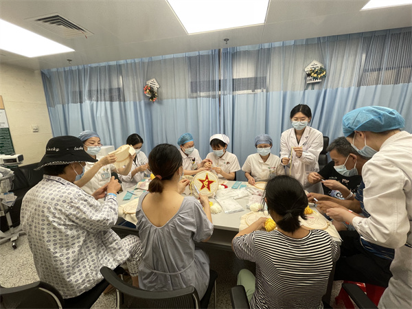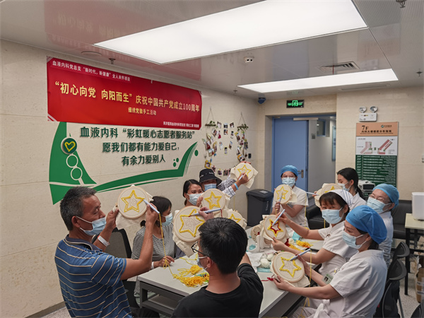 在建党百年华诞到来之际,血液内科党总支部为丰富住院患者及家属的精神文化生活,增强患者及家属住院期间的社会交往及社会支持,并通过艺术疗愈为患者、家属及医务人员减压,6月24日下午,血液内科联合我院社工部及团委开展了“初心向党,向阳而生”庆祝中国共产党建党100周年绣党徽手工活动。 本次活动邀请到了10余位患者、家属及医务人员共同参与。伴随着悠扬、充满浓郁爱国情怀的红歌,在医务社工的指导下,从起初的不熟练到慢慢对绣针使用游刃有余,大家在红色文化氛围下回忆畅聊党的百年历史,共享治疗和工作外的闲暇一刻,沉浸于手工创作带来的内心的宁静与心灵的疗愈。