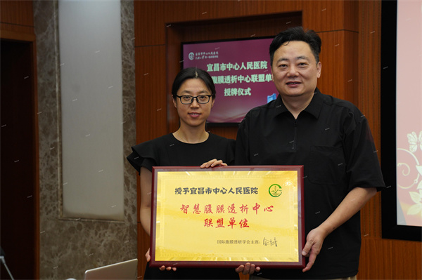 2022年7月2日,由华中科技大学同济医学院附属同济医院肾内科牵头,“智慧腹膜透析中心联盟单位”落户到了宜昌市中心人民医院肾内科。华中科技大学附属同济医院肾内科主任徐钢、副主任姚颖一行与宜昌市中心人民医院院长杨简、副院长龙兵、肾内科主任杨林、主任宋志霞参与了此次授牌仪式。
