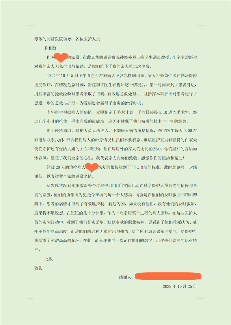 49岁的河南籍杨女士突发脑出血,独自在同济医院神经外科住院治疗20天后顺利康复并出院。为了表达对医护们的感谢和敬意,杨女士的丈夫和女儿们联名写了这封感谢信。