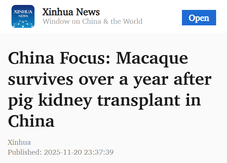 [Xinhua News]China Focus: Macaque survives over a year after pig kidney transplant in China