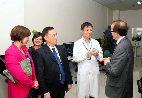 Zunaechst sprach Vizepraesident Wu seine herzlichen Willkommensgruesse aus und gab eine detaillierte Einfuehrung des Tongji Klinikums. Dann fuehrten beide Seiten eine Diskussion bezueglich der Umsetzung der Kooperationsvereinbarung, welche im Jahr 2011 mit der Universitaet Bordeaux unterzeichnet worden war.